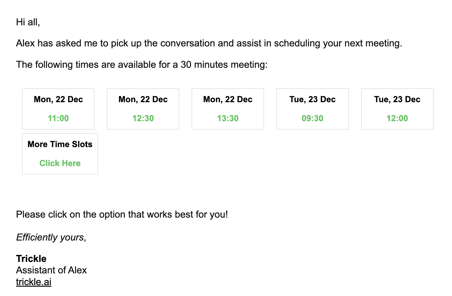 Trickle will reply-all with proposed times and a booking link with extra time slots.